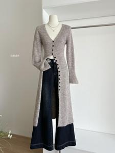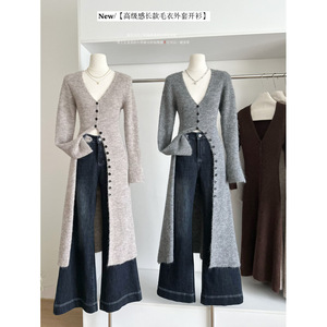 秋冬高级感法式气质V领显瘦毛衣连衣裙女中长款棕色针织内搭长裙