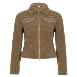 欧美跨境女装秋冬保暖时尚灯芯绒外套上衣复古休闲棕色翻领夹克女
