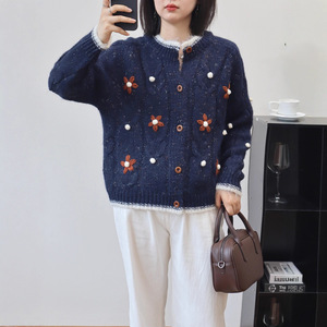 2025秋冬新款韩版宽松慵懒风针织开衫刺绣设计感温柔风毛衣外套女