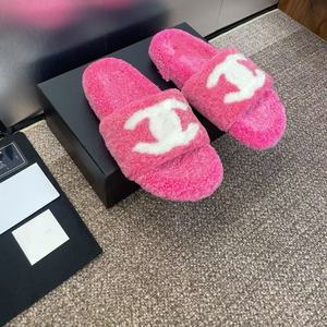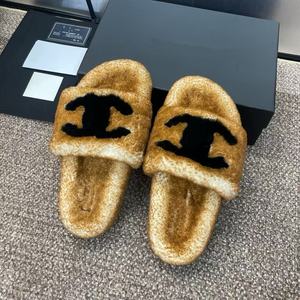 高定25年新款小香秋冬新款时尚百搭羊羔毛女拖鞋拼色露趾居家鞋