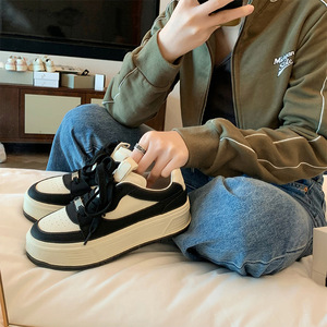 牛皮~真皮小白鞋女圆头拼色松糕厚底增高休闲运动鞋百搭系带板鞋