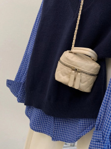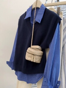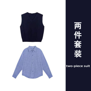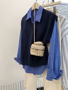 藏蓝色v领针织马甲背心女装早秋季学院风毛衣叠穿衬衫两件套上衣