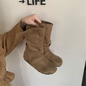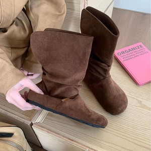 牛皮版~复古大圆头翻折两穿绒面短靴女25年新款内增高西部马丁靴