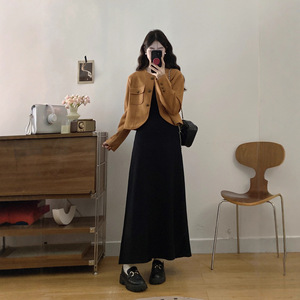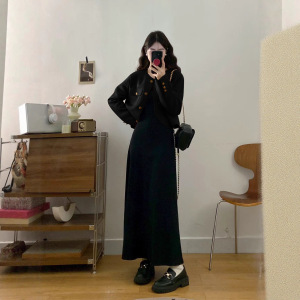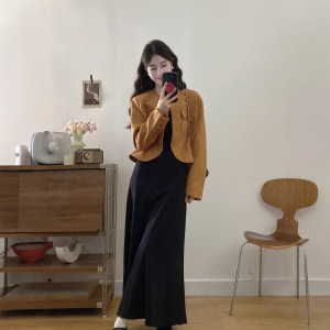 大码时尚套装女秋季小香风长袖外套胖MM黑色吊带连衣裙显瘦两件套
