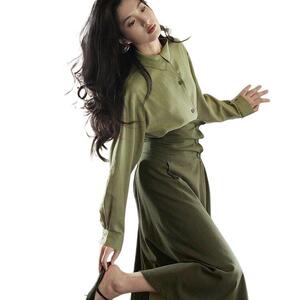 法式绿色不对称领复古套装女2025秋季新款感衬衫半身裙潮
