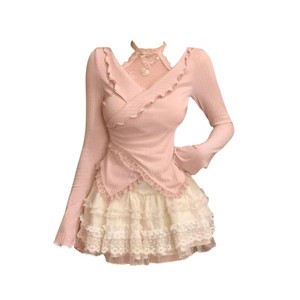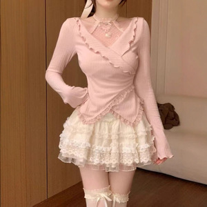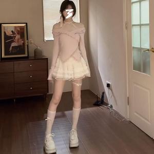 纯欲甜美套装秋季修身显瘦设计感不规则上衣+蕾丝半身裙两件套女