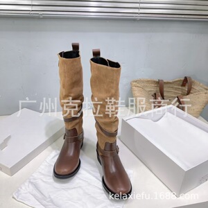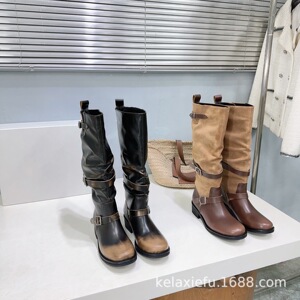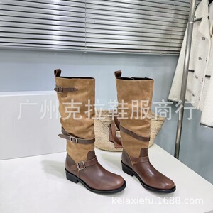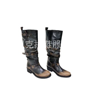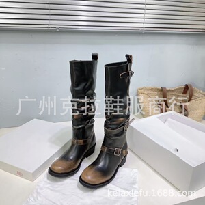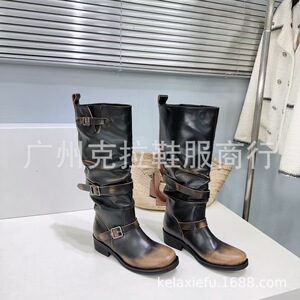 高定25ss秋冬新品真皮圆头擦色复古粗跟一脚蹬皮带扣高筒马丁靴女