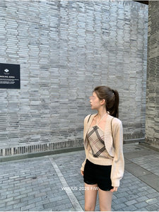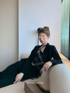 Wuuus【英格兰街角】格纹挂脖吊带两件套女格子一字肩抹胸上衣