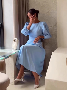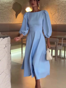 欧美亚马逊跨境女装2025新款蓝色圆领七分袖高腰气质温柔风连衣裙