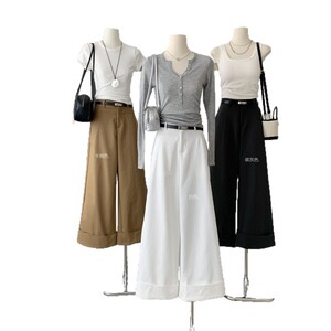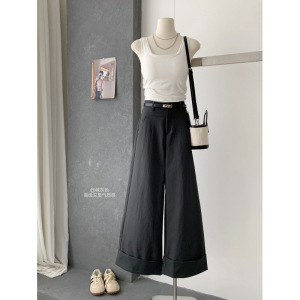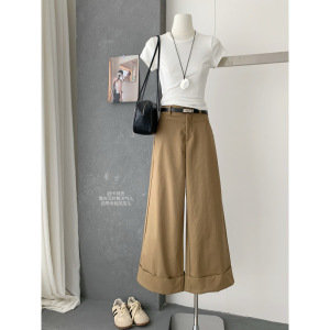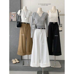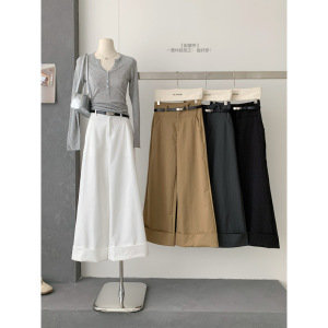 韩系简约气质高智感ol风翻边西裤配腰带女秋季高腰显瘦长裤