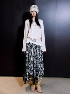 瀚柯设计感不规则下摆蓝黑格纹羊毛混纺半身裙
