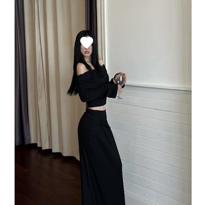 2025秋季新款辣妹炸街套装一字领长袖上衣褶皱显瘦半身裙两件套