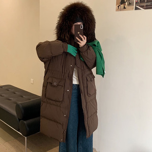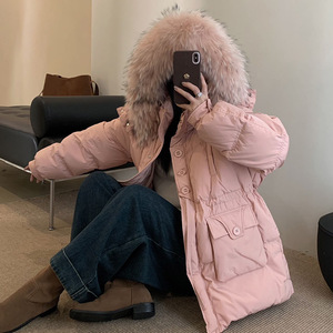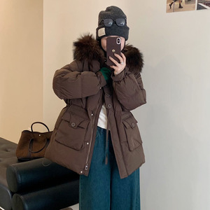 貉子大毛领长短款羽绒服女2025冬季新款三圆扣收腰白鸭绒工装外套