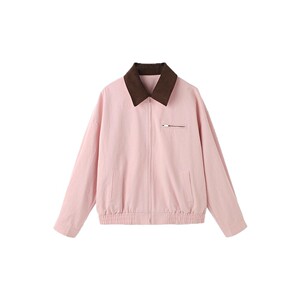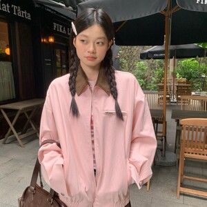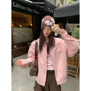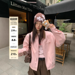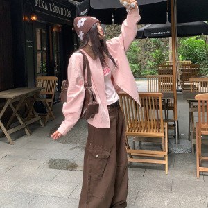 宋正恩粉拼咖巴恩风洗水短款外套女秋季宽松休闲新款翻领开衫上衣