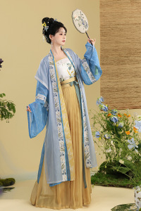 鸢尾清 蓝色背心+蓝色褙子+蓝色吊带+黄色下裙 四件套
