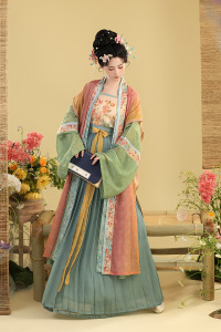 彩花絮 粉色背心+浅绿褙子+粉色吊带+蓝色下裙 四件套