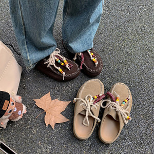 牛翻皮穆勒拖鞋女厚底博肯鞋秋冬新款真皮圆头系带串珠包头拖鞋女