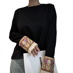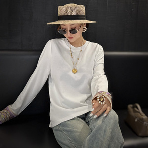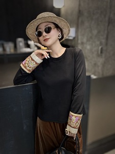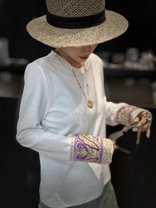 宽松舒适百搭小衫重工刺绣袖口拼醋酸钉珠绣花螺纹雅纱棉打底上衣