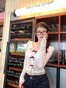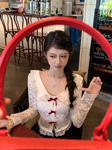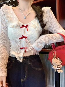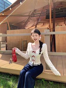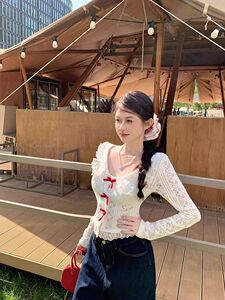 撞色蝴蝶结蕾丝花边长袖打底衫女秋冬2025新款修身内搭短款小上衣