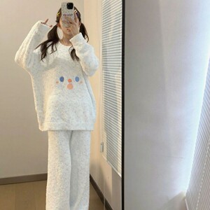 秋冬季新款半边绒睡衣女加绒加厚刺绣甜美可爱笑脸保暖家居服套装