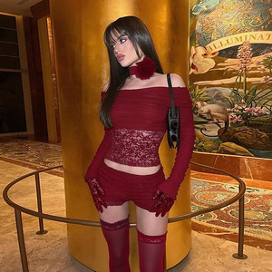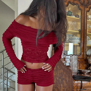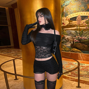 WQ25299欧美跨境新款长袖女装 2025肌理感拼接蕾丝一字肩长袖上衣