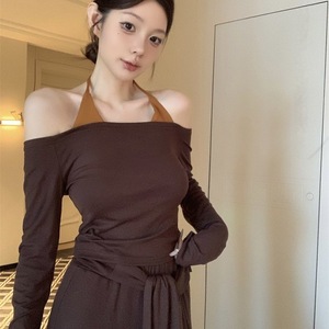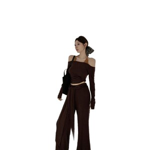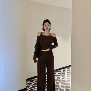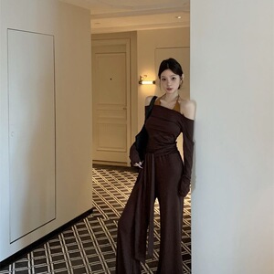 休闲气质套装女秋冬新款时尚设计感假两件长袖t恤高腰垂感阔腿裤