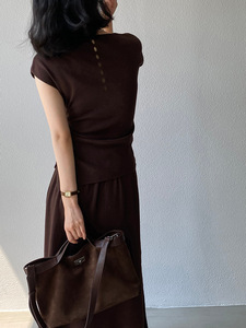 江左 午后慵懒曲~气质V领抽绳修身T恤上衣女+高腰长裙两件套N619