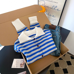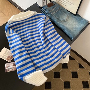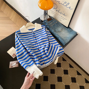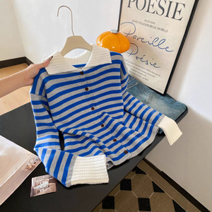 十三行蓝色条纹POLO领毛衣开衫外套女秋冬穿搭慵懒高级感针织上衣