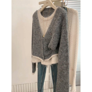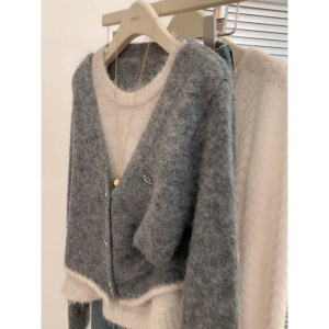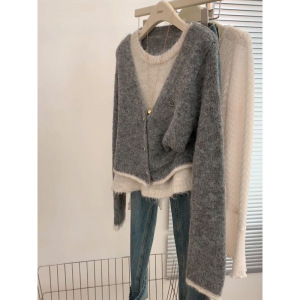 韩系慵懒风灰色假两件针织开衫毛衣女秋冬小众高级感超好看上衣潮