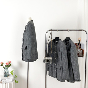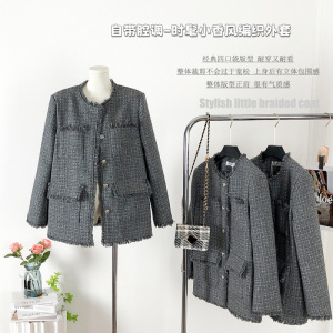 轻奢高级感灰色中长款小香风外套女复古编织小个子毛边圆领上衣