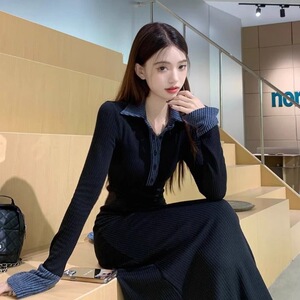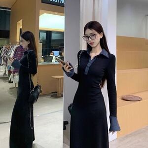 黑色高级感气质翻领长袖连衣裙女冬季新款收腰修身显瘦荷叶边长裙