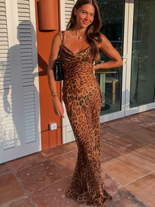 2025秋冬新款欧美荡领豹纹吊带长款连衣裙设计感气质时尚跨境通勤