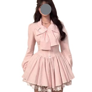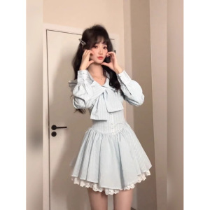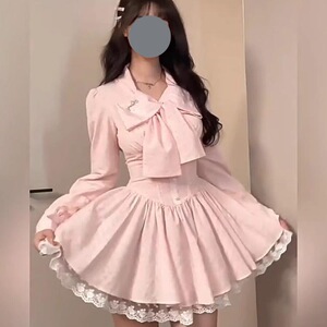 甜美纯欲秋季蕾丝花边蝴蝶结高级感长袖蓝色收腰显瘦蓬蓬连衣裙女
