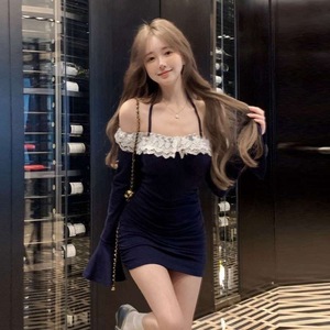 法式纯欲风撞色拼接蕾丝挂脖长袖连衣裙女2025秋季新款显瘦包臀裙