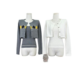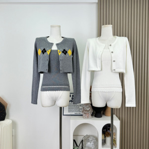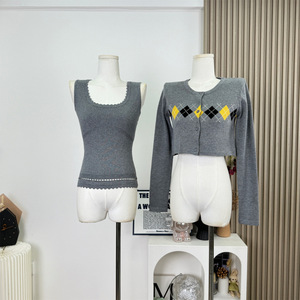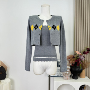 "蒙马特学院"小众撞色经典老钱菱格纹针织开衫吊带两件套