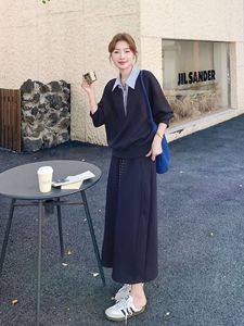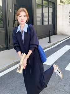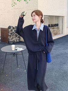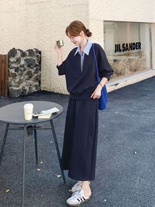 松弛感穿搭藏青色假两件卫衣套装女秋2025新款休闲半身裙两件套