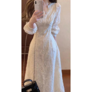 2025秋季法式甜美温柔风白色蕾丝连衣裙长袖收腰气质长裙子千金感