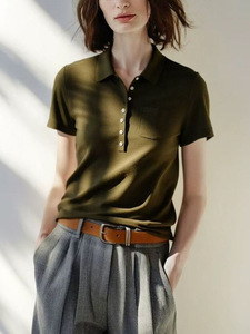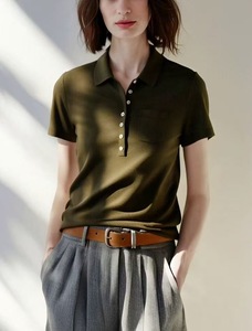 老钱风复古绿色翻领短袖T恤女夏季新款排扣设计百搭修身显瘦上衣