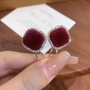 酒红色植绒方形锆石银针耳钉轻奢高级感耳环气质复古简约大气耳饰