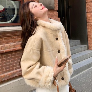 2025年冬季新款宽松保暖麂皮绒皮毛一体立领上衣外套米黄色雪尼尔