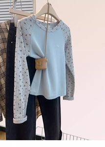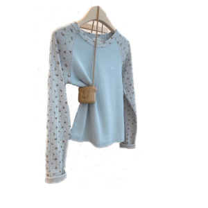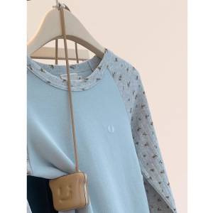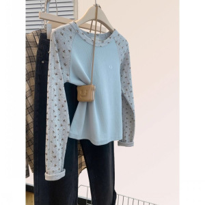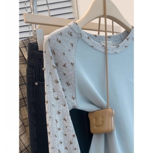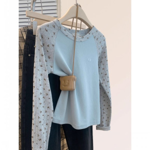 韩系碎花插肩袖长袖T恤女春秋季新款小清新修身百搭打底短款上衣