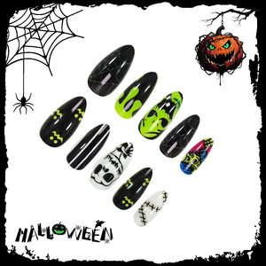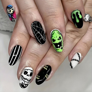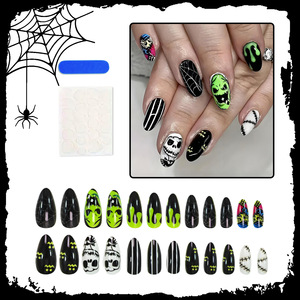 24片跨境万圣节款杏仁穿戴甲鬼怪蝙蝠线条欧美ins风美甲甲片现货
