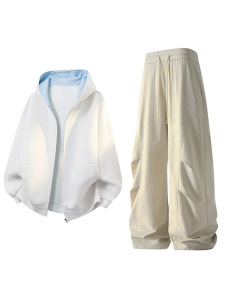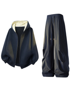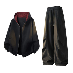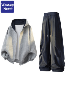 WASSUP连帽撞色简约休闲套装男士春秋季卫衣褶皱裤子青少年两件套