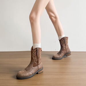 羊皮版~英伦风短靴女鞋棕色复古刺绣西部牛仔靴瘦瘦靴马丁靴女潮