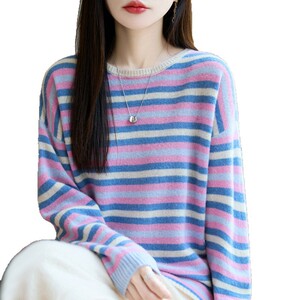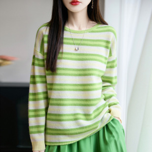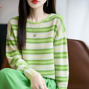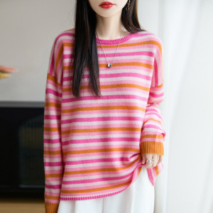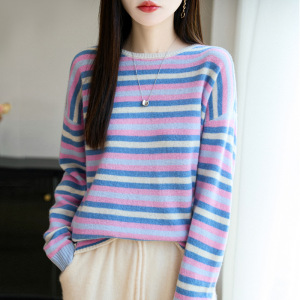 100羊毛衫女式圆领针织打底多巴胺彩条纹设计感毛衣秋冬新款内搭