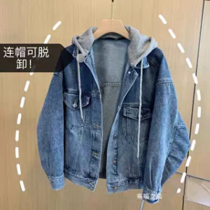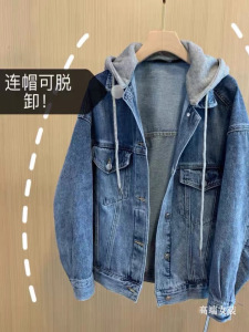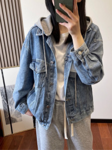 盐系高街假两件连帽水洗蓝色渐变牛仔外套小众设计感春秋款