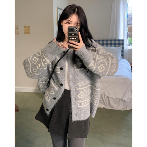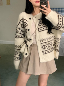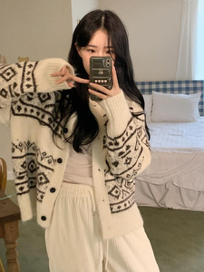 2025秋冬款单排扣几何图案女式毛衣高级感休闲慵懒风针织开衫外套
