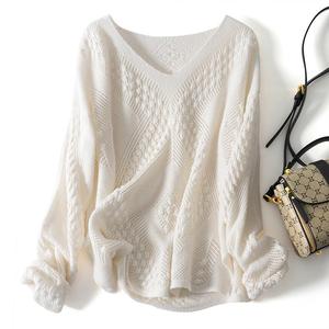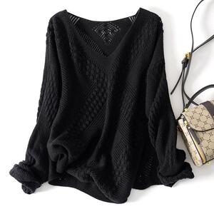 秋冬新款胖mm300斤大码钩花镂空长袖针织衫v领套头宽松慵懒上衣女