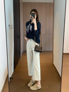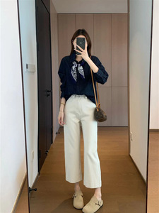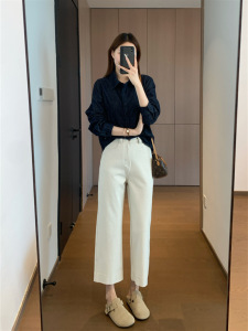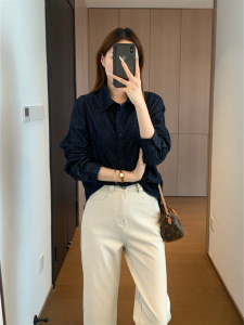 THEWOW 飒爽气场 棉复古牛仔深蓝色宽松版翻领撞色丝巾衬衫