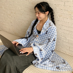 蓝格子蝴蝶结(单层:牛奶绒披肩毯)